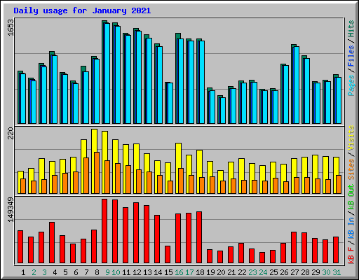 | Day | Hits | Files | Pages | Visits | Sites | kB F | kB In | kB Out | ||||||||