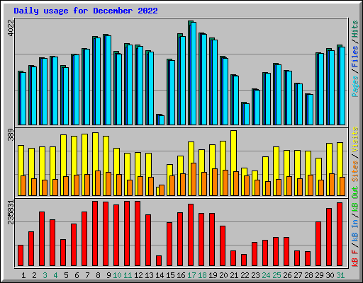 | Day | Hits | Files | Pages | Visits | Sites | kB F | kB In | kB Out | ||||||||